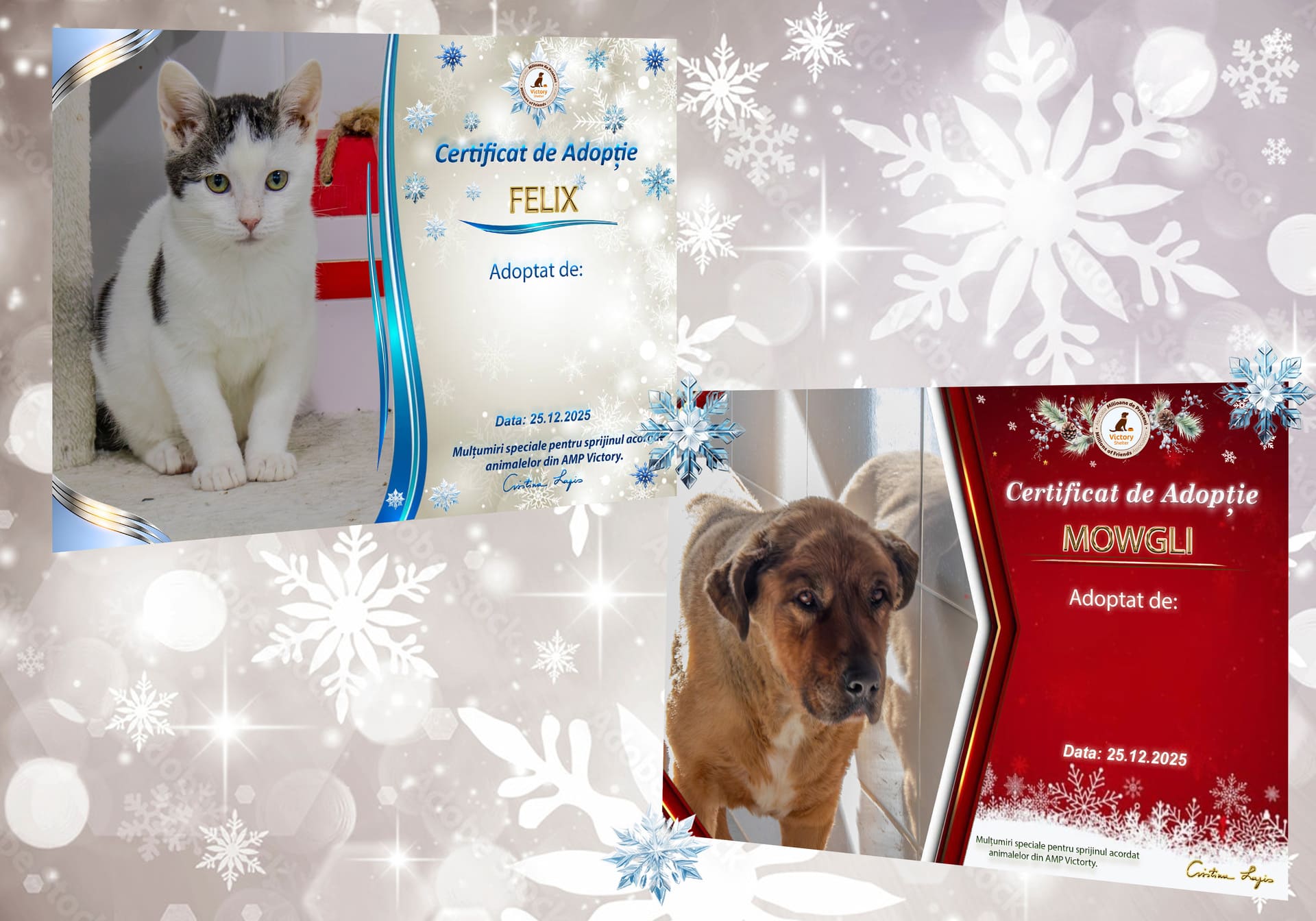 Achiziționând Certificatul de Adopție de Crăciun, contribui direct la îngrijirea animalului ales: hrană, tratamente medicale, vaccinuri, confort și protecție în Adăpostul AMP Victory.